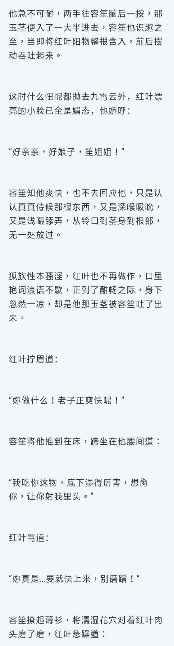 红叶被cao1得xing起,也不害臊了,yun着她手指吃,温热的she2toutian舐指feng,其态妖娆淫媚,不可言说。